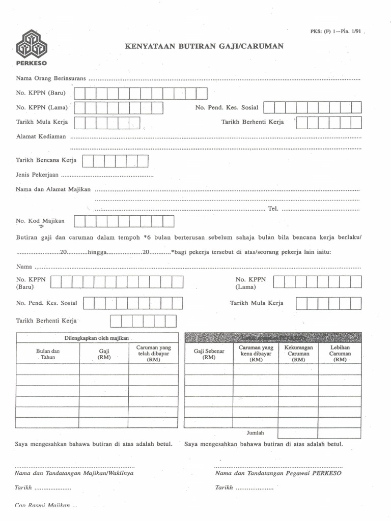 SOCSO Form PKS F 1 Pin 191 3. Kenyataanbutirbutirgajicaruman pks f 1 free download as pdf file pdf or read online for free. Tandatangan nama diisi dengan huruf besar doktor insurans cop dan alamat klinik 4 salinan kad pengenalan 5 rekod kedatangan kad perakam waktu pengesahan majikan 6.