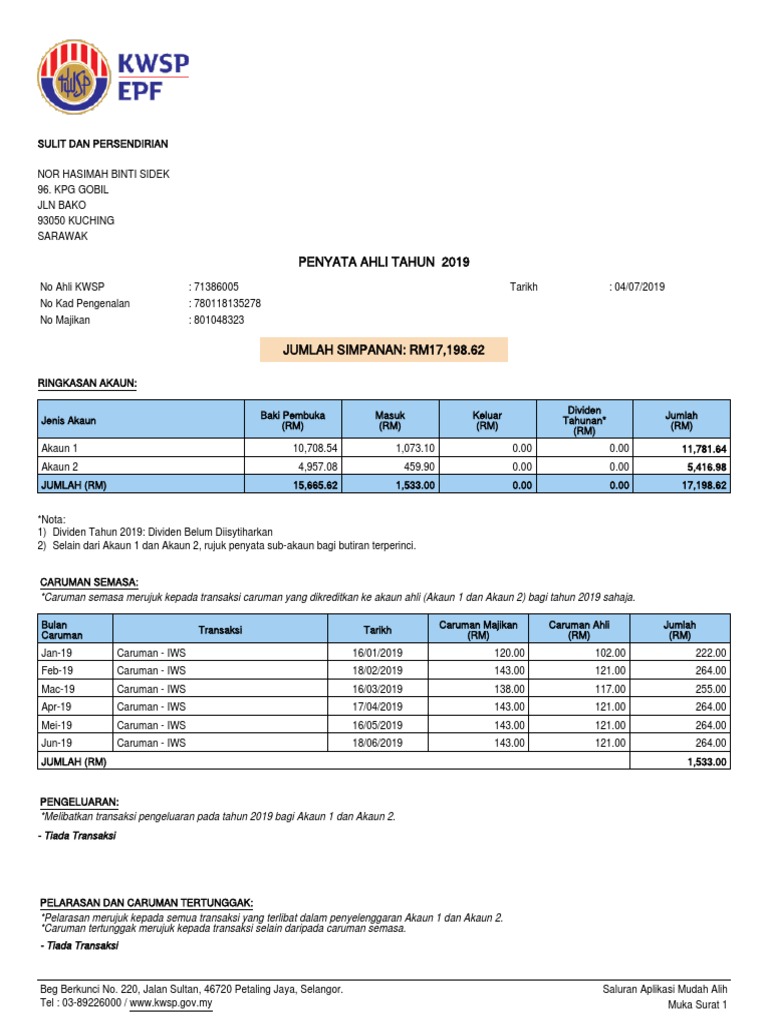 Anda dinasihatkan menyemak penyata ini pada setiap bulan dan menyimpannya sepanjang tempoh pekerjaan anda.