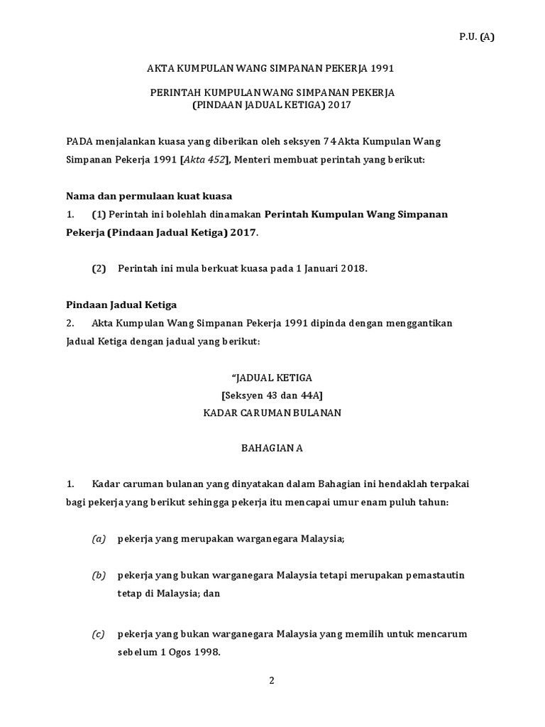 P U A Akta Kumpulan Wang Simpanan A Akta Kumpulan Wang Simpanan Pekerja 1991 Perintah Kumpulan Wang Simpanan Pekerja Pindaan Jadual Ketiga 2017 Pada Menjalankan Kuasa Yang Pdf Document. Caruman wajib anda dikira berdasarkan pendapatan bulanan mengikut Kadar Caruman Bulanan Jadual Ketiga. Atas permintaan saya carikan dan linkkan jadual caruman.