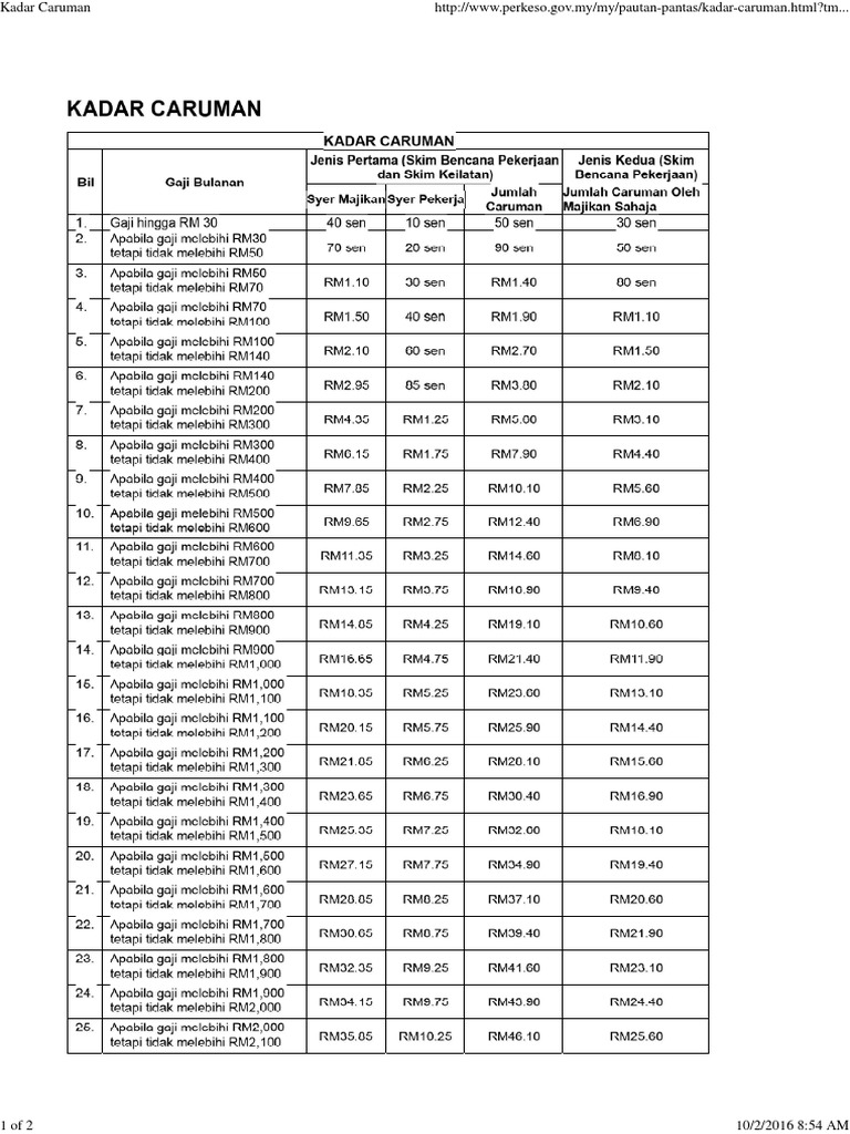 Nilai Pampasan Kemalangan Perkeso. Memastikan semua pekerja yang diambil oleh majikan langsung telah didaftarkan dan caruman mereka dibayar. Pendapatan Bulanan Bayaran Caruman Bulanan Bayaran Caruman Setahun.